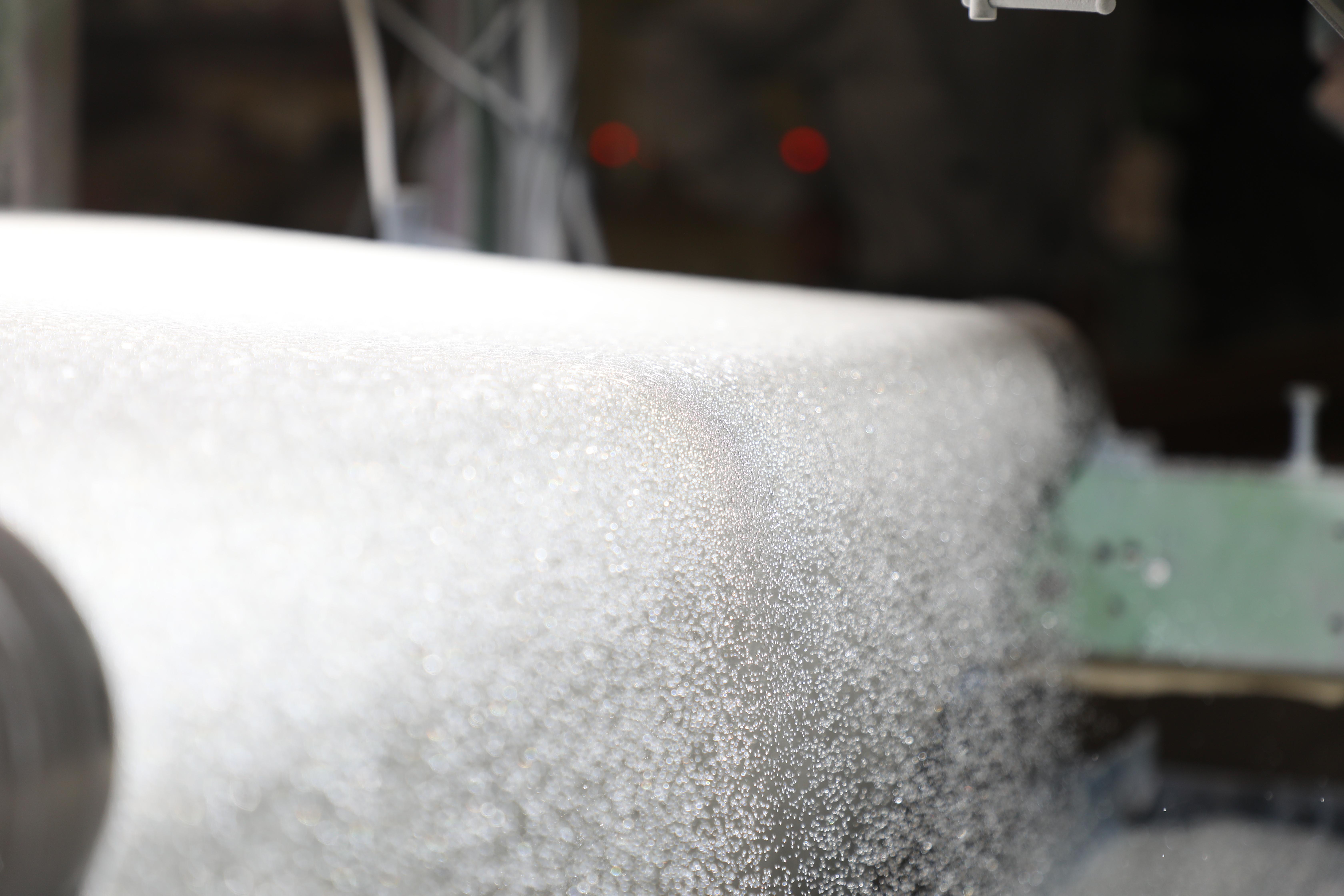 道路の白線の中に入っているガラスビーズを壁紙に使用しております。全国の窓ガラスの廃材を集めて再融解して作られた100%リサイクルのガラスビーズを使用しています。